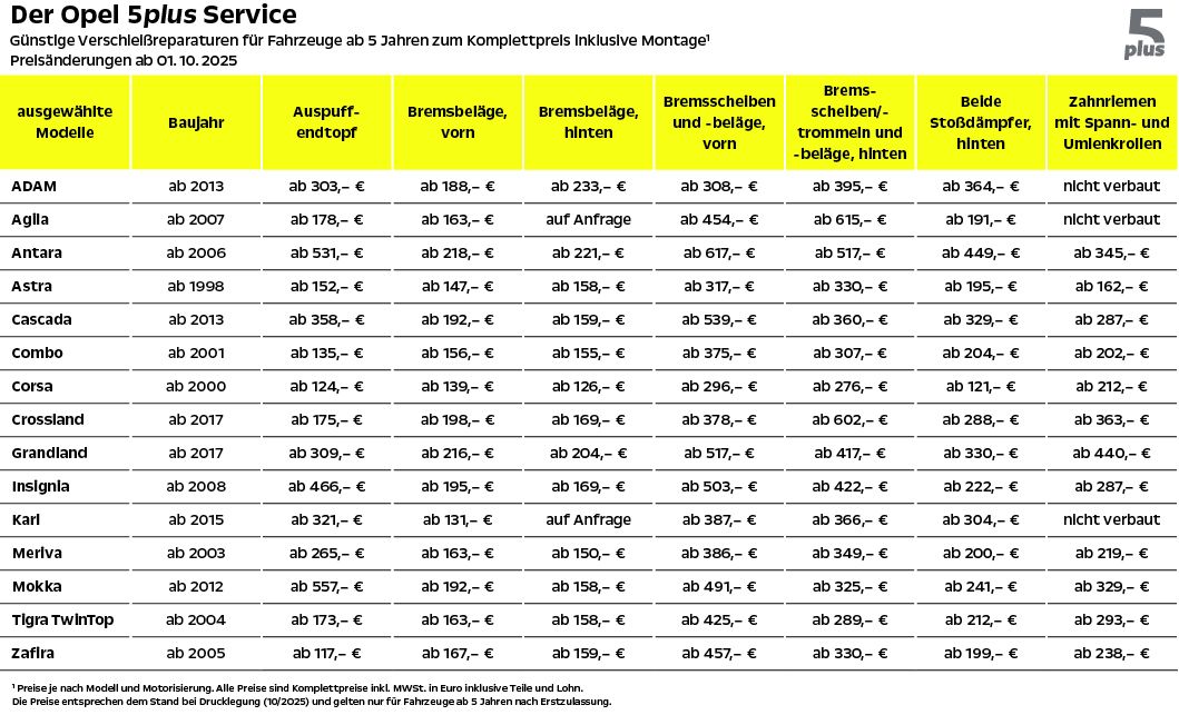 Wir bieten Ihnen mehr als 1.000 Verschleißreparaturen für viele Opel Pkw ab 5 Jahren nach Erstzulassung zu sensationellen Komplettpreisen inklusive Montage.
